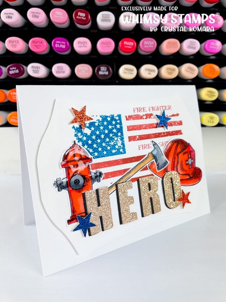 Clearly Whimsy Stamps Collection "Military Heroes" This stamp set contains images and sentiments honoring those in the armed forces. Pair with our Military Family clear stamps, Military Camo Background stamp, and/or our Military Die Set, each sold separately.