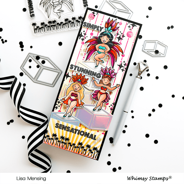 This cool die set has 5 different dies that allow you to create countless combinations of geometric backgrounds, shaker cards, and more, and it's great for making stages or platforms to showcase your critters and characters. Fits both slimline, and smaller card bases.