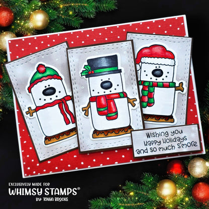 Four adorably cute marshmallow snowmen along with coordinating sentiments. Perfect for sending holiday smiles across the miles. Coordinates with our S'mores outline die set, sold separately.