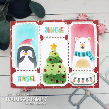 This adorably fun stencil set includes three layering stencils to create cute Christmas and Winter scenes each inside individual ticket stubs. The design allows for mix-n-match of words or patterns inside the smaller ticket boxes. Coordinates perfectly with our Terrific Tickets Collection, (sold separately) and gives even more versatility and crafty Christmas fun time!