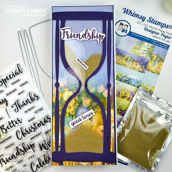 Set of 7 innovative dies - includes an hour glass, 3 different base and top styles to choose from, feet, and 2 sets of spindles all to create custom hour glass designs. Also includes sand dies for both the top to the bottom of the hourglass. Or you could try adding some of our colored sand sprinkles (sold separately) for an even more realistic looking hourglass shaker card. Use for Birthdays, New Years, Weddings, Halloween, Christmas, and so much more.