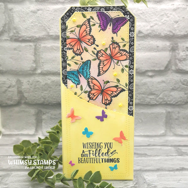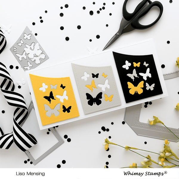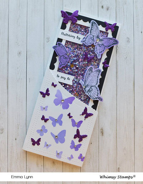 Our Slimline Pocket dies are an exciting and innovative addition to our Slimline Die collection. This die will create a pocket for adding hidden surprises, and it also includes a die to cut a window in the pocket to create a peekaboo element or a shaker card. Decorate with the beautiful fluttering butterflies or other countless creative ideas.
