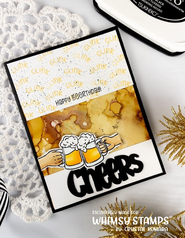 Cheers! A great set for celebrating or for masculine cards. Includes large and small sentiments and images perfect for bringing on the cheers! Pair with the Frosty Mug or Frosty Glass die sets for additional cheers! Each sold separately.