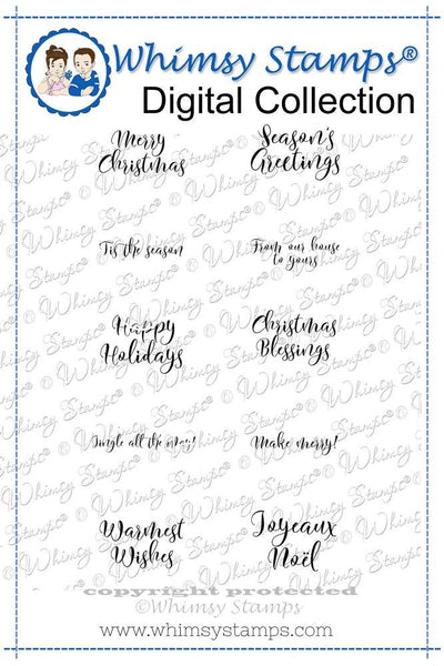 "Christmas Sentiments" designed by Bev Rochester for Whimsy Stamps. This includes 4 different versions - one in black, one in gold, one in silver, and one in red.