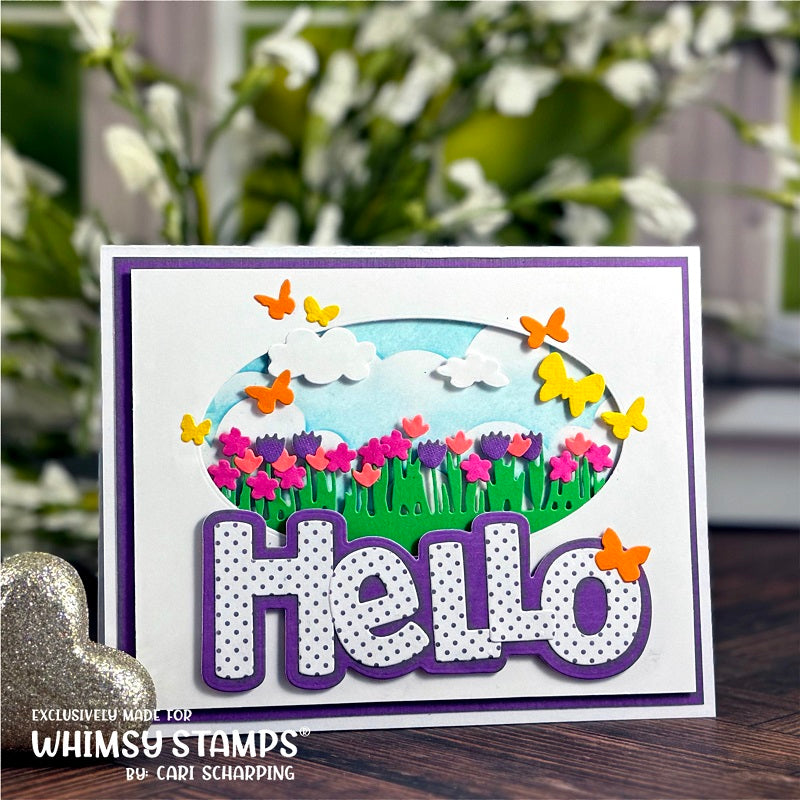This die set includes 3 individual dies to create different outdoor scenes. Use the border die to create grass or bushes, use the clouds as additional bushes for adding depth and/or use the clouds as clouds too. Sprinkle in some dainty butterflies to complete your scenes. Set includes 1 grass border die, 1 cloud/bushes shapes with 5 different sizes, and 1 die that cuts 9 various sizes and shapes of butterflies. Combine with our Field of Flowers die set (sold separately) for even more combinations.