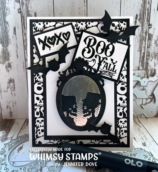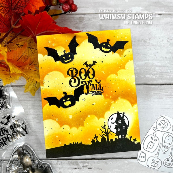 Set of 5 large sentiments and a spooky house/graveyard silhouette scene perfect to sharing haunting Halloween creations.