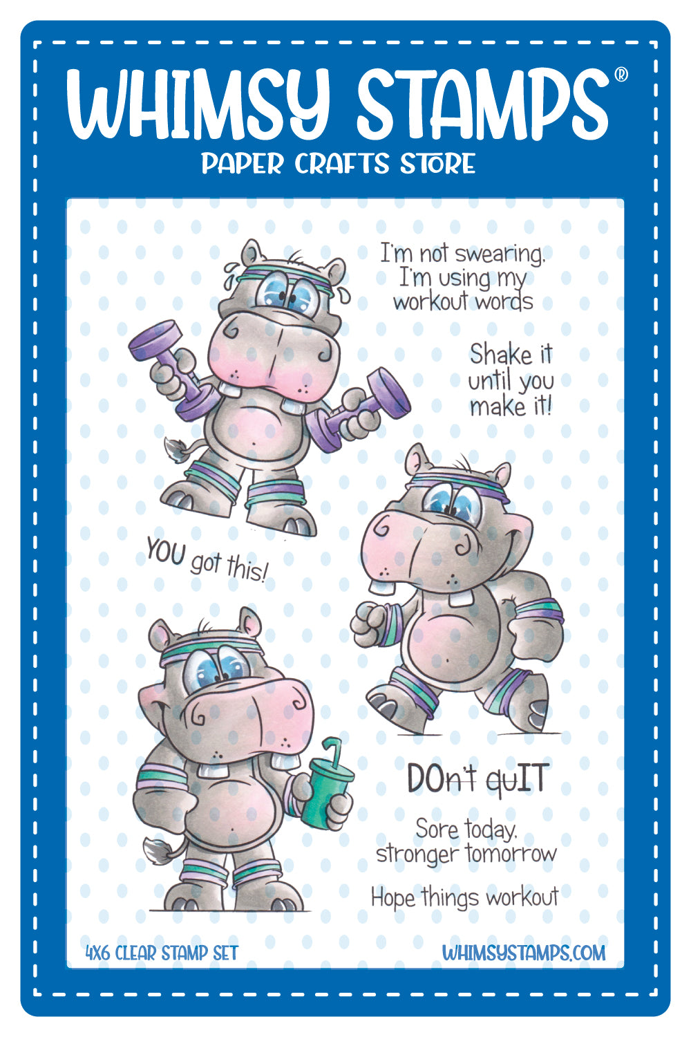 Clearly Whimsy Stamps Collection "Hippo Workout" clear stamp set, illustrated by Dustin Pike for Whimsy Stamps. © Whimsy Stamps.