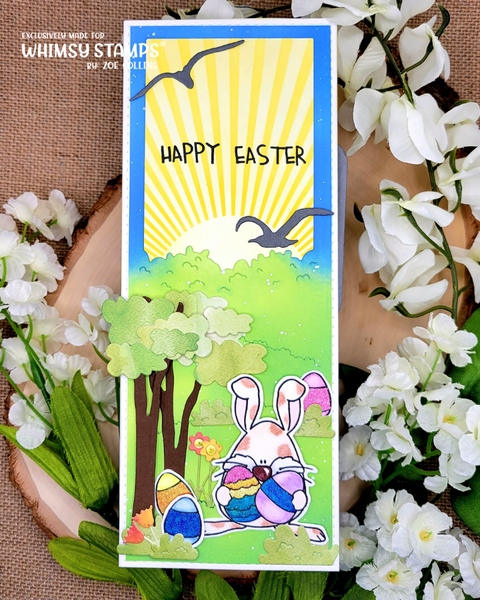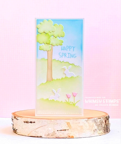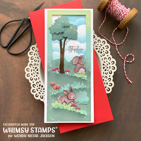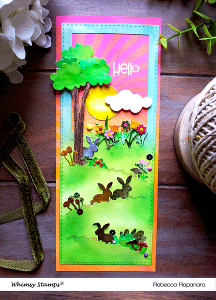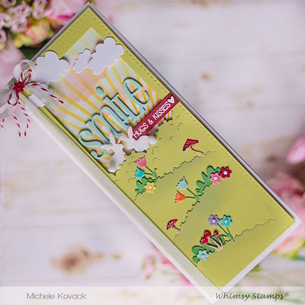 Like many of of Slimline dies the Slimline Meadow Die gives you a multitude of design options. You can use it with, or without the insert piece, and the insert piece can be used as bushes or flip it upside down to use as tree tops. This extra large die set also includes a meadow layer and accent pieces such as flowers, mushrooms, bunnies, clouds, bushes, a tree, and grassy cut outs for endless design possibilities.