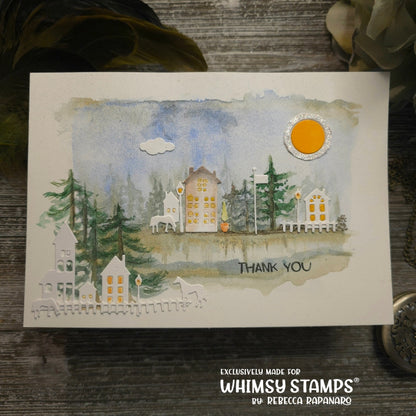 Another awesome Slimline Die added to our growing collection to help you create tall and skinny cards quickly and easily. This die set includes a simple frame, 2 landscape border dies, and little houses, trees, and more to help you create beautiful scene cards without the need for any stamps.